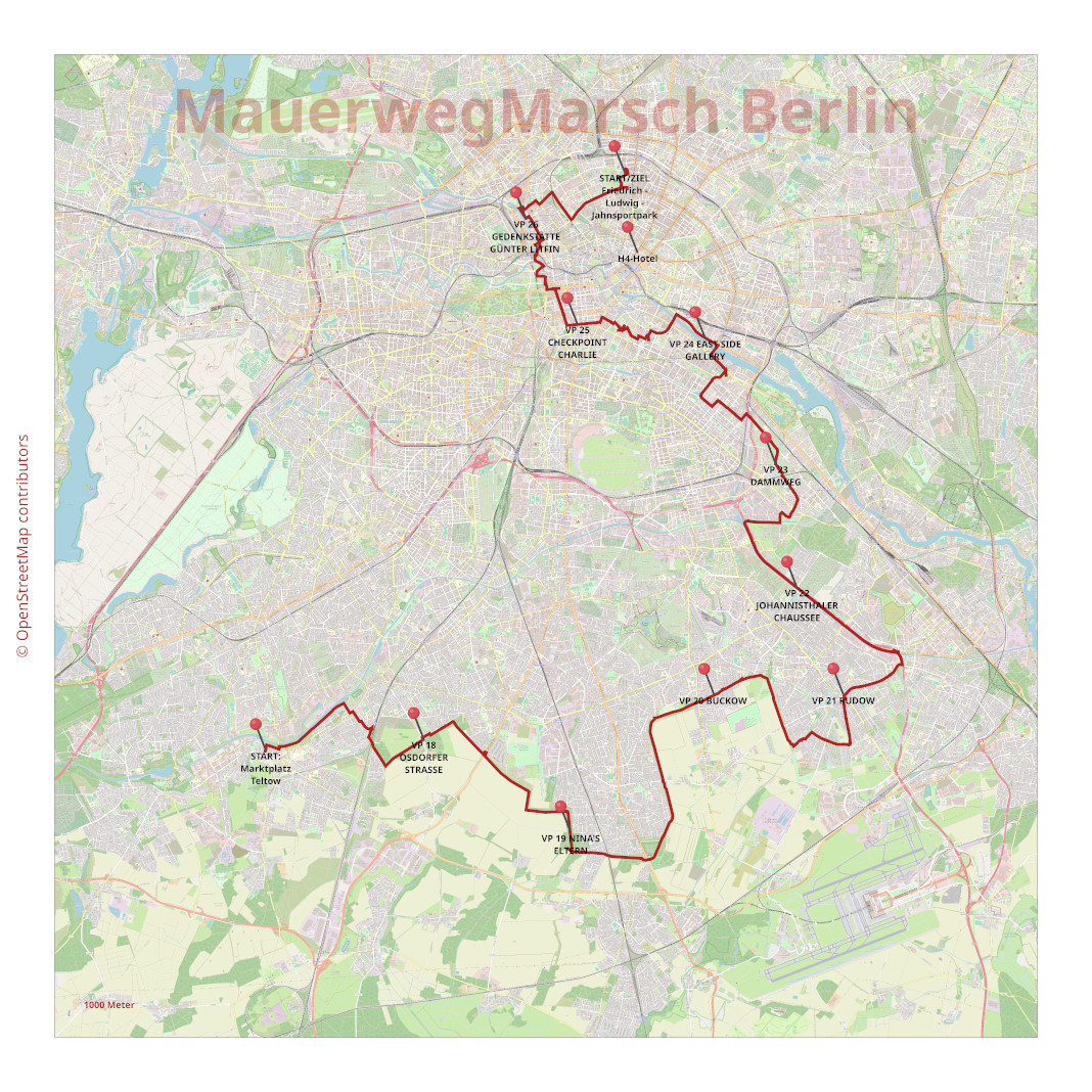 The start takes place on the market square in Teltow, the finish location of the Berlin Wall Walk is at Friedrich-Ludwig-Jahnsportpark in the Berlin district Prenzlauer Berg. Along the trail (which will be completely marked) there will be a total of 9 refreshment stations (VPs) at a distance of 5 to 9 km. There the participants can expect food and beverages suitable for runners and, of course, an encouraging atmosphere.